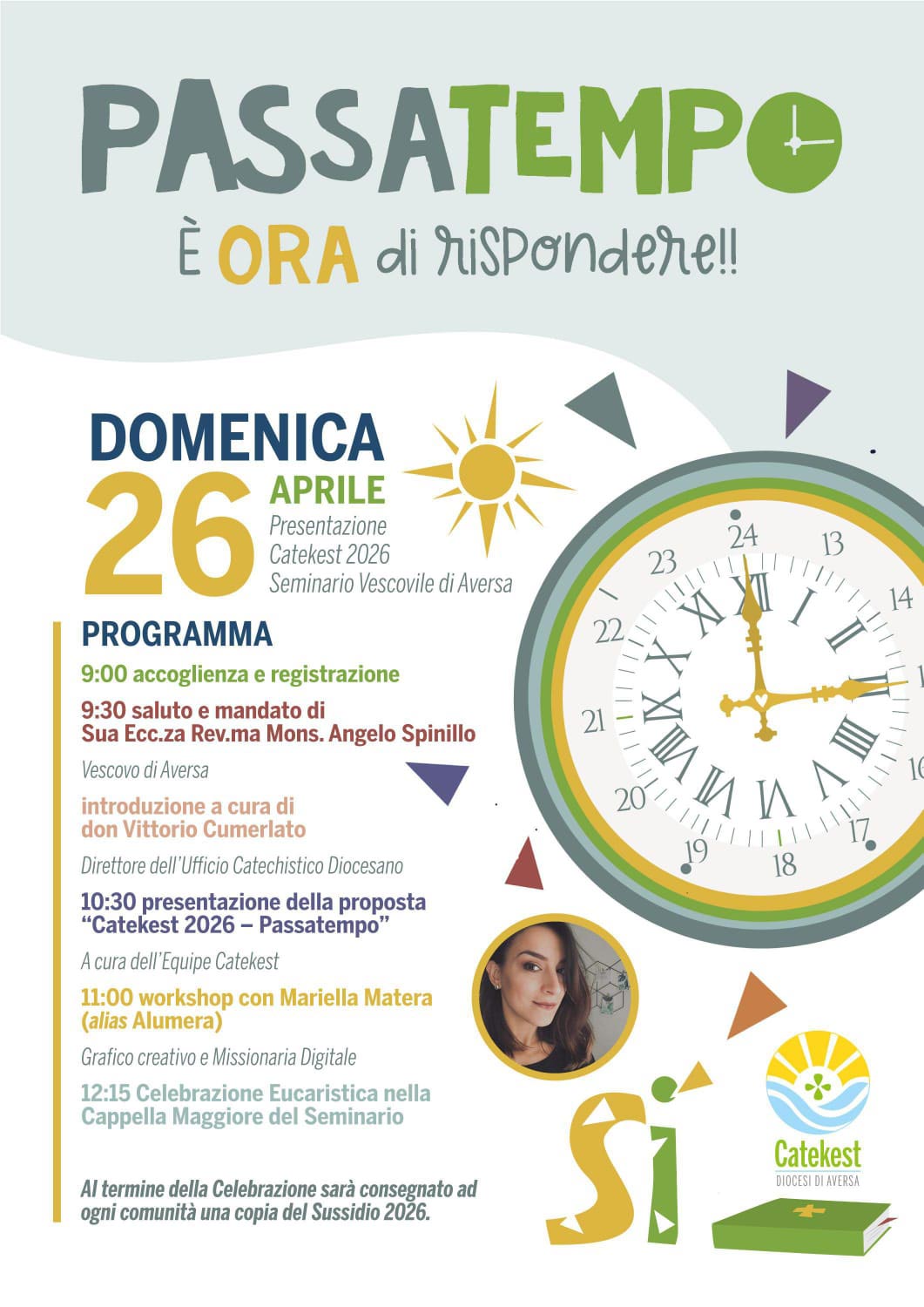 PassaTempo: è ora di rispondere”: la diocesi di Aversa chiama a raccolta tutti gli adolescenti e i giovani delle comunità parrocchiali del territorio in vista dell’attesissimo Catekest 2026. L’esperienza di catechesi estiva e animazione oratoriale verrà infatti presentata ufficialmente domenica 26 aprile 2026, presso il Seminario Vescovile di Aversa.