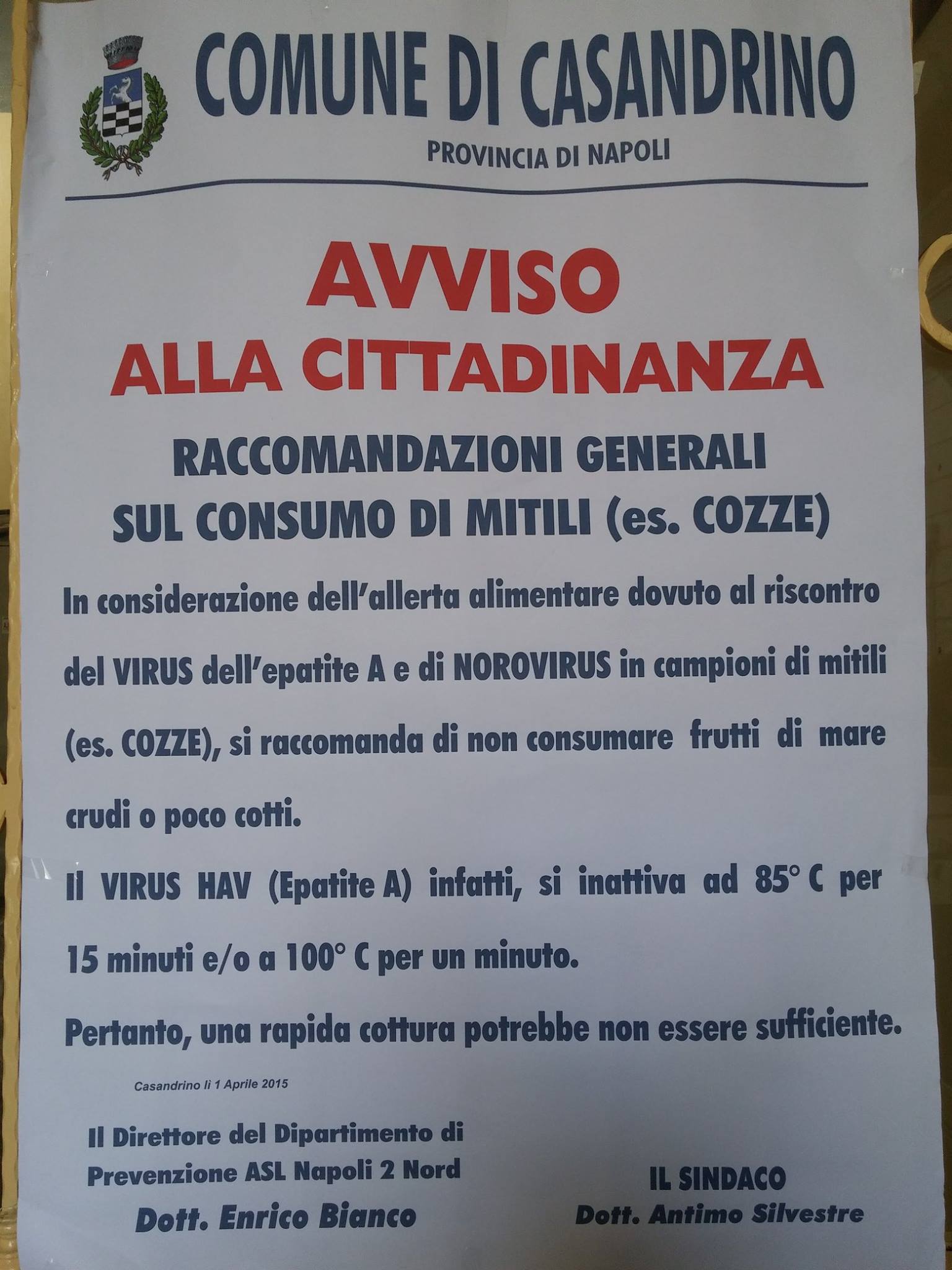 Il comune di Casandrino ha diffuso un avviso che invita i cittadini ad evitare il consumo crudo dei mitili, come ad esempio le cozze, a causa del virus dell’epatia “A”. L’Asl raccomanda di non mangiare i molluschi crudi o poco cotti, per il rinvenimento in alcuni esemplari analizzati, del virus dell’apatite ‘A’.