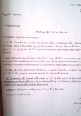 Il Movimento 5 Stelle ha presentato un esposto per denunciare la vandalizzazione del Parco Balsamo e la sua trasformazione in luogo di scorribande, di bivacco e di cessione di cannabis da parte di un gruppo di bulli provenienti in prevalenza dal napoletano.