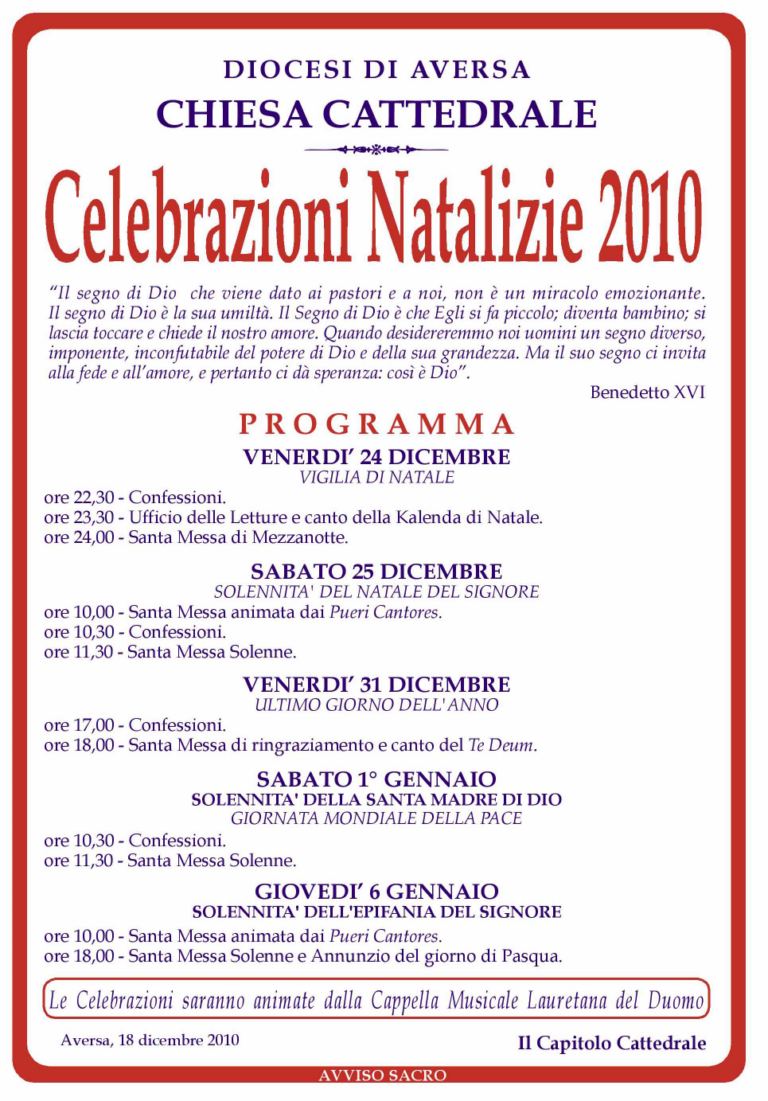 Nelle abbottonate stanze della Diocesi di Aversa si sta vivendo un clima strano che traspare anche verso l’esterno, una situazione anomala che i poco comunicativi vertici ecclesiastici alimentano ancora di più, almeno cinque righe di comunicato stampa potrebbero farle, ma è chiedere troppo. Evidentemente né la Diocesi, nè la Santa Sede ritengono opportuno far capire cosa sta veramente succedendo. Qualche settimana fa da indiscrezioni di stampa, né ufficialmente confermate, né tantomeno smentite, si è appreso che l’Arcivescovo Mario Milano che guida la Diocesi dal 14 dicembre 1989 avrebbe presentato le dimissioni “per motivi di salute”, anche se oramai manca poco alla scadenza del suo mandato per raggiunti limiti di età, in quanto compie 75 anni il prossimo mese di aprile. Poi sempre indiscrezioni di stampa hanno dato per quasi certa l’imminente nomina ad amministratore diocesano, in via provvisoria, del pastore casertano Angelo Farina. In ultimo, altre indiscrezioni hanno dato per certa la nomina a nuovo Vescovo di Monsignor Angelo Spinillo, che attualmente guida la Diocesi di Teggiano-Policastro. Nulla per adesso è ufficiale. Intanto il consueto programma di celebrazioni natalizie (nella foto) quest’anno non reca lo stemma del Vescovo, né lo stesso prelato è citato, infatti non sono previsti suoi interventi alle funzioni. Una stranezza mai vista, eppure Milano sarebbe “dimissionario” e non definitivamente dimesso. Qualcuno sussurra che le presunte dimissioni siano state consigliate al prelato, chissà. Sotto la guida di Monsignor Mario Milano si sono vissuti momenti davvero bui per la comunità cattolica della nostra Diocesi. Sono vari i fatti eclatanti che hanno visto l’Arcivescovo protagonista: