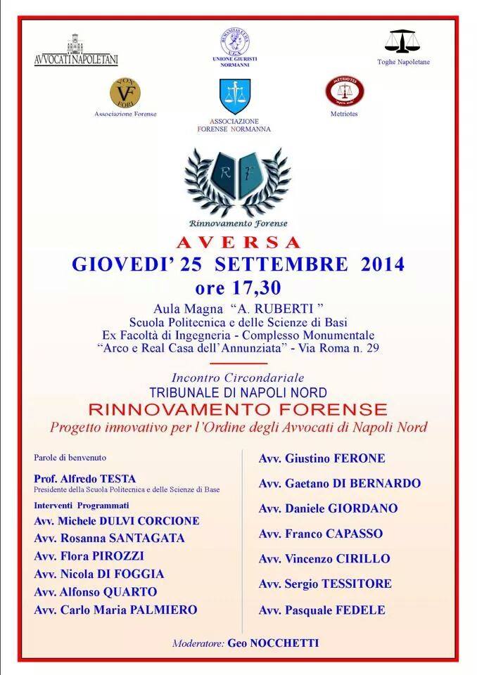 incontro circondariale del tribunale di napoli nordGiovedì 25 settembre 2014, alle ore 17.30, ad Aversa nelll’Aula Magna “A. Ruberti” del complesso monumentale “Arco e Real Casa dell’Annunziata”, si terrà un incontro di “Rinnovamento Forense” (cicondario del Tribunale di Napoli Nord). Saranno presenti: Associazione Forense Normanna, Unione Giuristi Normanni, Avvocati Napoletani, Toghe Napoletane, Vox Fori e Metriotes, Aiga e Oua.
