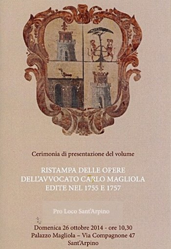 A Sant’Arpino domenica 26 ottobre 2014, alle ore 10,30, presso il Palazzo Magliola in via Compagnone 47, si terrà la cerimonia di presentazione del volume “Ristampa delle opere dell’avvocato Carlo Magliola, edite nel 1755 e 1757”. L’iniziativa è organizzata dalla Pro Loco di Sant’Arpino che, grazie al contributo economico dalla