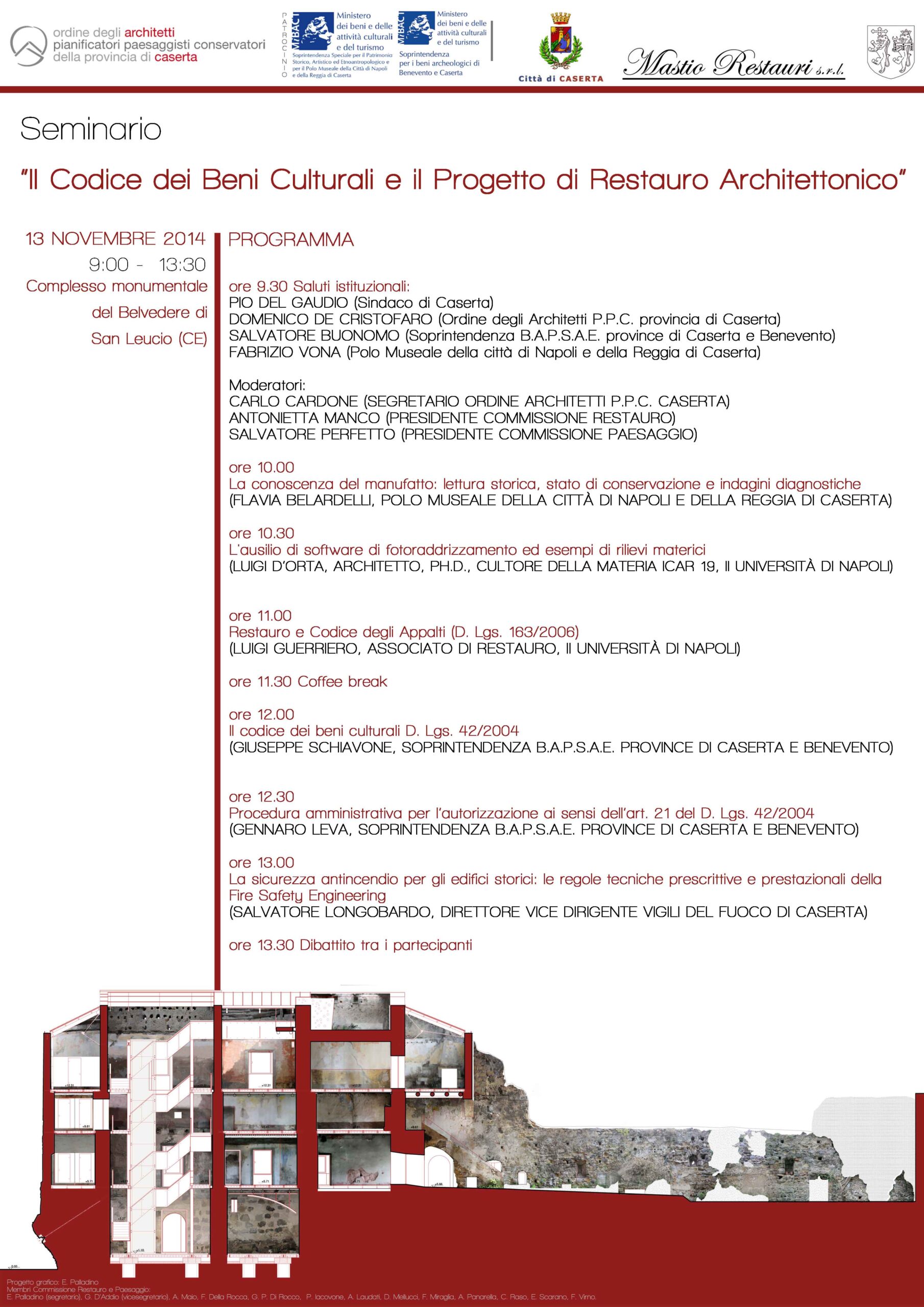 Giovedì 13 novembre dalle 9.30 alle 14.00 si terrà, presso la sala convegni del sito monumentale del Belvedere di San Leucio, il seminario “Il Codice dei Beni Culturali e il Progetto di Restauro architettonico”, organizzato dall’Ordine degli Architetti P.P.C. della provincia di Caserta e dalla Commissione Restauro e Beni culturali del suddetto Ordine.