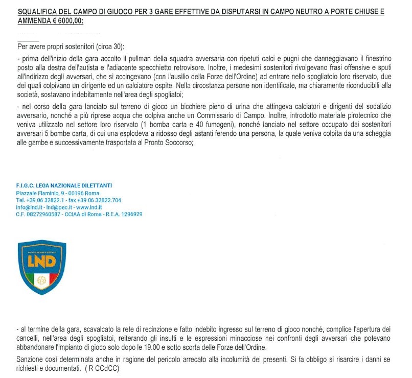 Il ritorno dell’Aversa in serie D è stato in parte rovinato dal comportamento indecoroso di pochi: addirittura una signora che era tra i tifosi del Modica è dovuta ricorrere anche alle cure del pronto soccorso. Abbiamo raccolto la testimonianza di Orazio Puglisi, uno dei più noti commercialisti di Modica e leader della Gilda degli Insegnanti di Ragusa che ha seguito la squadra della sua città nella trasferta aversana, situazioni confermate dalla giustizia sportiva (pubblichiamo le motivazioni, poco edificanti, del giudice sportivo): il campo di Aversa è stato squalificato per tre giornate e la società multata per 6 mila euro. Racconta Puglisi: