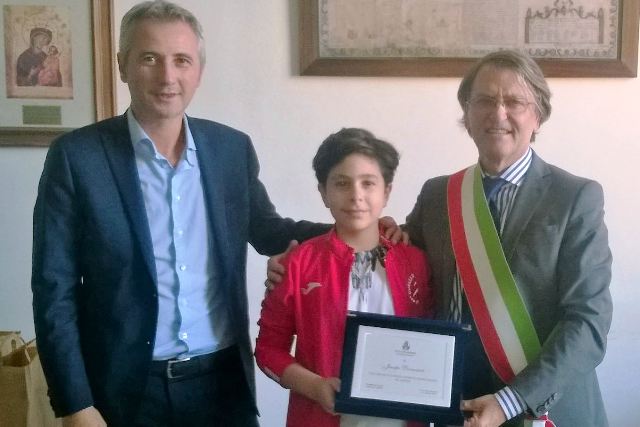Dopo i successi di questa estate, con la conquista di una medaglia d’oro nella categoria Speed Slalom ai campionati nazionali ed una medaglia d’argento in Coppa Italia, nella specialità Slalom Singolo, è stato ricevuto dal Sindaco Enrico de Cristofaro, che gli ha consegnato una targa di benemerenza per testimoniare la gratitudine della città per i suoi successi sportivi. “E’ la seconda volta – ha dichiarato il primo cittadino – che rendiamo onore ai meriti di questo giovane aversano, mi fa immensamente piacere che la nostra comunità sia conosciuta e rappresentata grazie alle imprese di Jacopo, un esempio di impegno e passione per lo sport.” Il piccolo Jacopo, che gareggia con le insegne della società Quelli del pattinaggio, è stato accompagnato dai genitori e dai parenti, dando poi un saggio della propria abilità nei corridoi del Comune .