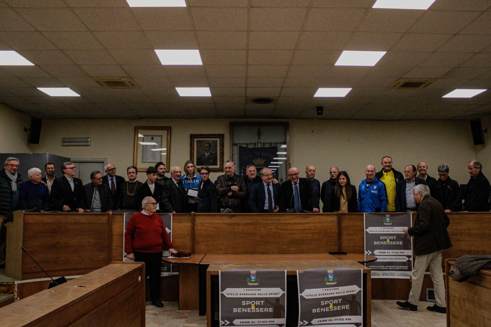 Lo scorso 24 febbraio nell’aula consiliare del Comune di Aversa si è svolta la manifestazione “Stelle Aversane nello Sport” organizzata dall’ente locale, sono stati conferiti riconoscimenti a: Sergio Di Meo, Vincenzo Del Villano, Marco Ibello, Pasquale D’Aniello, Sara Maria Kowalczik, Domenico Del Piano, Alfredo Diana, Matteo Fiore, Paolo Santulli, Teofilo Coscione, Filippo Rotunno, Antonio Andreozzi, Cristiano Brancaccio, Giovanni Rosselli, Annalisa Tirozzi, Lorenzo Laudadio in memoria, Cristian Verde, Riccardo Russo, Arca Atletica Aversa Agro Aversano e Fernando Vitale: atleti, dirigenti, società ed associazioni sportive che si sono distinti per risultati nel corso del 2024 o che hanno fatto dell’impegno sportivo uno dei valori fondanti della loro vita.